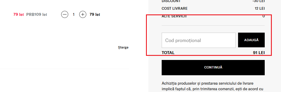 Odata ce comanda a fost plasata, codul nu mai poate fi aplicat retroactiv. Asigura-te ca introduci codul inainte de a apasa butonul “Plasare comanda”.