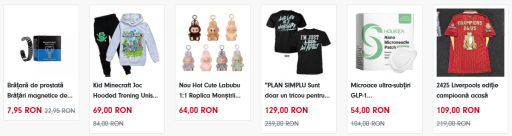 Ai la dispozitie milioane de produse din categorii diverse: electronice si gadgeturi, moda (haine, incaltaminte, accesorii), cosmetice si produse de ingrijire, articole pentru casa si gradina, jucarii si produse pentru copii, echipamente sportive, suplimente alimentare si wellness.